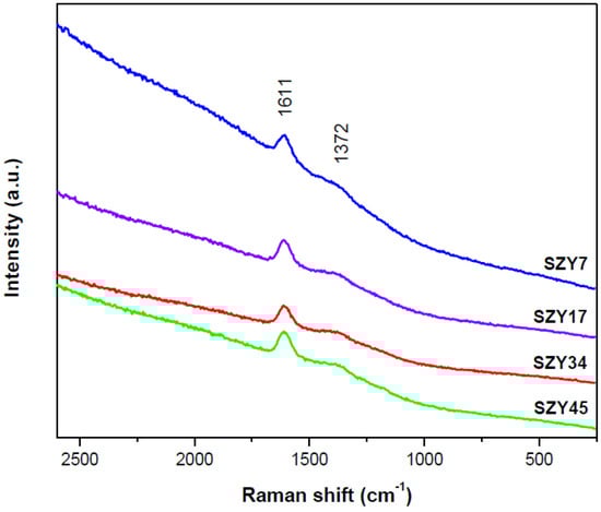 The Raman spectra of the spent catalysts are shown in Figure 12. The samples exhibited a noticeable shift at 1611 cm−1 and a very weak band at 1372 cm−1. These bands can be related to coke deposited on the catalyst, attributed explicitly to C=C, and to ring stretches of large polyaromatic compounds, presumably with two-dimensional and sheet-like topology [,,]. This result suggests that coke deposited on the Y-type zeolites could be produced by secondary reactions of acrolein and olefin intermediates, namely condensation and polymerization, in agreement with previous reports [,]. Similarly, in the case of the synthesis of pyridine bases from the reaction between ammonia and aldehydes, it has been determined by solid-state 13C NMR and FTIR that the coke formed on ZSM-5 catalysts was constituted by compounds with aliphatic and alkoxyl groups, as well as highly unsaturated polyalkenes and condensed aromatics [,].
