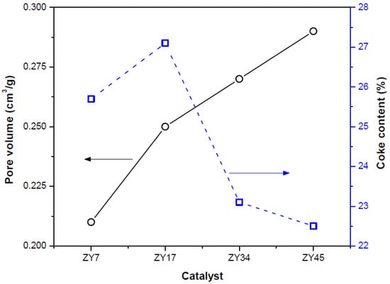 Comparison of the pore volume of the fresh zeolites and the coke content of spent catalysts.