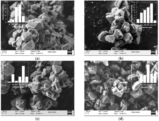 The scanning electron micrographs (SEM) of the Y-type zeolites are shown in Figure 6. All the samples displayed grains with shapes of the variable and faceted pyramid and hexagonal prisms, which are typical of the Y zeolite [,]. Furthermore, the surface of the zeolites was rough, porous, and slightly cracked. The average grain size of the zeolites in this study was 400 nm and did not change significantly with the Si/Al atomic ratio variation. The values correspond approximately with those reported by Taufiqurrahmi et al. [] of 500 nm for a commercial Y zeolite.