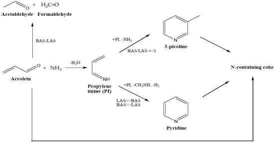 From the above results, it is proposed that the reaction between acrolein and ammonia over Y-type zeolites occurred according to the reaction scheme depicted in Figure 16. Under the reaction conditions of this study (low reaction temperature and NH3/acrolein molar ratio = 2), acrolein was partially converted to cracking products, namely acetaldehyde, and formaldehyde. These aldehydes could not produce pyridine bases since there was not enough NH3 to make them react and were easily removed from the reactor due to the high gas hourly space velocity (GHSV = 4994 h−1). On the other hand, acrolein and ammonia react over acid sites to produce propylene imine, as previously reported []. Then, this intermediate can undergo a Michael addition reaction with another propylene imine over Brønsted or weak Lewis acid sites, closing the ring structure and producing 3-picoline with the liberation of ammonia. Alternatively, propylene imine can condensate and cyclize with another propylene imine by a Diels-Alder reaction over Lewis acid sites, producing pyridine [,]. Due to its basic nature and as suggested by the EDXS results of the spent catalysts, 3-picoline, and pyridine can be strongly absorbed over acid sites, being part of the coke deposited in the catalyst.
