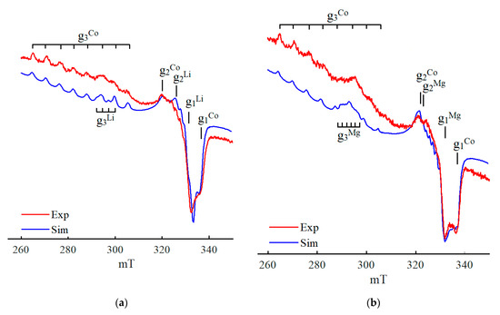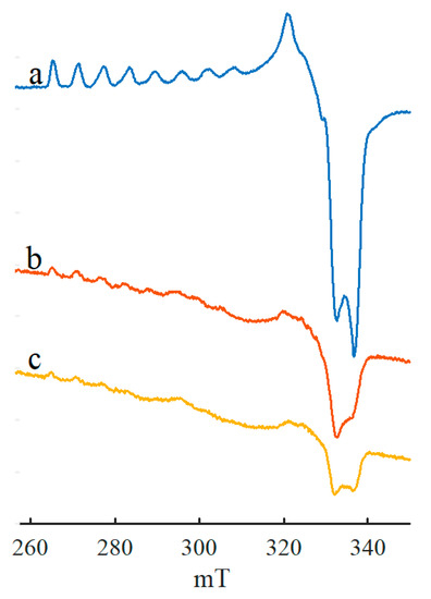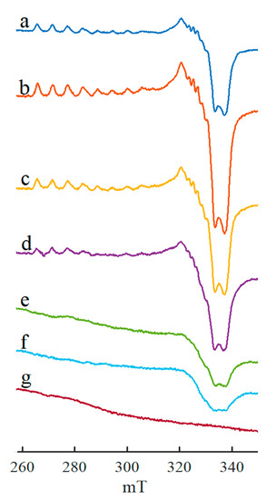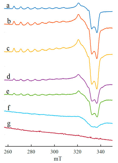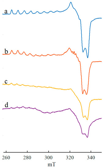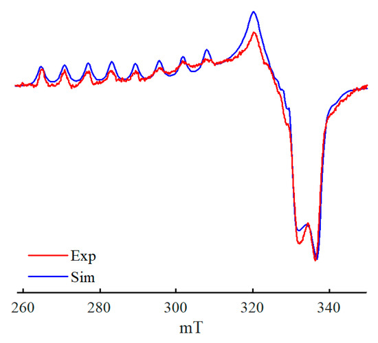 All the above spectra (Figure 1, Figure 2, Figure 3, Figure 4, Figure 5, Figure 6 and Figure 7) show experimentally obtained results. To confirm the reliability of the spectral interpretation, mathematical simulation is required. In this work, the “EasySpin” module of the Matlab package [86] was employed, which takes into account only the electronic Zeeman and hyperfine coupling in the first order of approximation.
