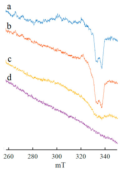The parameters and/or intensity of the recorded signals, as well as the intensity of the ferromagnetic resonance signal, all other things being equal, also depend on the nature of the cocatalyst [69,77] (see Figure 4).