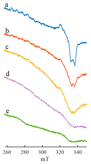 EPR spectra of the catalytic system formed on the basis of AlEt3 in an argon atmosphere, (a) Co(acac)2, (b) Co(acac)2∙0.5H2O, (c) Co(acac)2∙3.0H2O, (d) Co(acac)2–AlEt2(OEt) and (e) Co(acac)2–AlEt3–3n-BuOH. Spectra were obtained under identical conditions. Spectra (a,b) were taken from [69,77].
