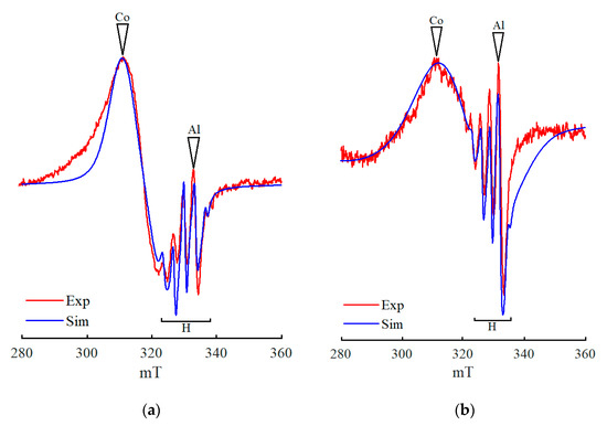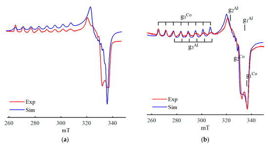 Previously [69,77], the EPR spectra of the systems formed on the basis of Co(acac)2–AlEt3 were simulated. It was assumed [87,88] that the spectrum presented in Figure 1a is a biaxially anisotropic signal with the following g-factor parameters: g⊥ = 2.050, g|| = 2.355 (Figure 8a and Supplementary Material). Comparison of the real and simulated spectra, as well as the treatment of all other spectra shown in Figure 1, Figure 2, Figure 3, Figure 4, Figure 5, Figure 6 and Figure 7 call into question the accuracy of these assumptions.