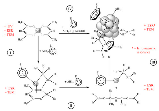 A solution of Co(acac)2 in arenes or in saturated hydrocarbons with arenes has a characteristic signal in the UV spectrum: λmax = 288 HM, ε288 = 16 200 L (mol cm)−1. Accordingly, transformation (I, Scheme 1) can be monitored in descending order or by complete disappearance of this signal. As shown above, the formation of bimetallic paramagnetic structures containing Co(0) is easily detected using the EPR spectroscopy. Meanwhile, the formation of LCo(Ar) (where Ar—arene, L = AlEt3 and/or AlEt2(acac)) (II, Scheme 1) structures and even their existence as a matter of fact is a theoretical conclusion. Since, in this case, cobalt is also formally Co(0), it should be visible by the EPR spectroscopy. However, new signals were not detected. Therefore, it can be assumed that the LCo(Ar) structures dimerize to form diamagnetic (via the interaction of two molecules of the Co(0) complex), etc. compositions. When they reach a critical concentration, these compositions give nano-sized compounds (III, Scheme 1), which appear in the EPR spectrum by the ferromagnetic resonance signals, and on TEM micrographs, they are observed as high-contrast structures. At the moment, it seems impossible to make more reasonable assumption. The implementation of path IV (see Scheme 1) was previously described in detail [69,70,77].