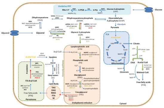Beopoulos et al., redirected carbon flux toward lipid synthesis in Y. lipolytica W29 by inactivating the oxidation of G3P into DHAP (GUT2 deletion), thus increasing G3P availability for lipogenesis via the Kennedy pathway that synthesizes TAG by an initial acylation of the G3P backbone with an acyl-CoA (Figure 1). The additional deletion of POX1-6 genes (Δpox1-6) which catalyze the limiting step of peroxisomal β-oxidation led to a four-fold increase in lipid content, reaching 42% of CDW. However, the Δgut2 strain did not grow on glycerol as the sole carbon source, probably because it is not likely that another enzyme catalyzes DHAP formation from G3P in glycerol medium [87]. To further investigate the role of the G3P shuttle in lipid accumulation, Dulermo et al., used different mutations in the G3P shuttle pathway (GPD1 overexpression or GUT2 deletion) to manipulate the G3P concentration. They showed that in a Po1d genetic background (Leu- Ura), GPD1 overexpression, GUT2 inactivation or both mutations together increased G3P 1.5-, 2.9-, and 5.6-fold, respectively, increasing TAG accumulation. They also showed that each strain with an increased G3P concentration also had a decreased glycerol concentration. Analysis of the genes involved in glycerol metabolism revealed that Y. lipolytica does not possess a gene for glycerol-3-phosphatase (GPP1, GPP2), thus indicating that G3P synthesis competes with glycerol synthesis and that a distinctive glycerol metabolism is committed to G3P and TAG synthesis, possibly contributing to its oleaginous character. Similarly, G3P shuttle dysfunctions coupled to an inactive β-oxidation pathway (deletion of POX1-6 or MFE1 genes) increased TAG and FFA. Transcriptional analysis of these strains revealed that the high levels of lipids (up to 65–75% of CDW) resulted from overexpression of genes involved in TAG synthesis (SCT1 encoding G3P acyltransferase, DGA1 encoding acyl-CoA diacylglycerol acyltransferase) and the repression of genes involved in TAG degradation (TGL3 and TGL4) (Figure 1). Their findings suggest that the availability of G3P and FFA limits TAG synthesis, and that the G3P shuttle and the β-oxidation pathway regulate the expression of genes involved in TAG homeostasis. They conclude that the synergistic contribution of acyltransferase gene expression to G3P synthesis is required for high levels of TAGs and lipid accumulation in Y. lipolytica [88]. The amplification of FFA production was also achieved by engineering Y. lipolytica W29 to uncouple the G3P shuttle and eliminate glycerol metabolism. Under lipogenic conditions with a limiting supply of glycerol, the triple mutant strain Δgpd1Δgut2Δpex10 redirected the carbon influx towards the synthesis of unsaturated FA that accumulated in the culture medium up to 2.03 g/L [89]. For additional reading regarding TAG biosynthesis through esterification of FA to glycerol backbone in which two precursors, FA and G3P, are required, the review by Xue et al., is strongly recommended. This review describes the interplay among glycerol metabolism, G3P synthesis and lipid production shedding light on how G3P affects lipid production by modulating glycerol metabolism [90].