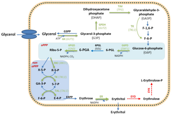 Osmophilic microorganisms in response to osmotic stress also produce erythritol [108]. Osmotic stress combined with heterologous expression of sugar alcohol phosphatase (PYP, YNL010W) from S. cerevisiae also increased sugar alcohol production in Y. lipolytica. It was found that osmotic stress increased the expression of genes involved in glycerol catabolism and the PPP, while intracellular metabolites such as amino acids, sugar alcohols, and polyamines produced at higher levels. Overexpression of the heterologous PYP gene increased both erythritol production and glycerol consumption, suggesting that this new enzyme creates an orthogonal route for increasing production. The expression of genes encoding the native glycerol kinase and transketolase further increased erythritol production. This strain was able to produce 27.5 ± 0.7 g L−1 and 58.8 ± 1.68 g L−1 erythritol from glycerol during batch and fed-batch growth in shake-flask experiments, respectively. Additionally, the glycerol utilization was increased by 2.5-fold. The engineered strain was also able to efficiently produce erythritol from crude glycerol [109]. Using proteomics to study erythritol production from glycerol under hyperosmotic pressure revealed that enzymes related to osmotic stress response (such as pyridoxine-4-dehydrogenase and the AKRs family) and polyols biosynthesis (such as transketolase and triosephosphate isomerase) had significantly increased expression levels [108].