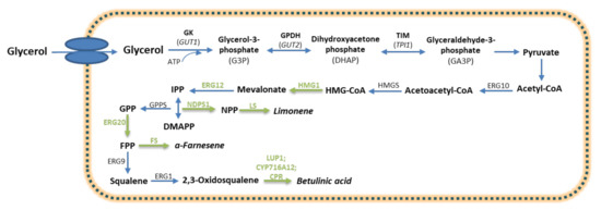 Glycerol was also used to produce betulinic acid by Y. lipolytica, a pentacyclic lupane-type triterpenoid and a potential antiviral and antitumor drug. In this case, the heterologous biosynthesis of betulinic acid was achieved by co-expressing lupeol synthase opAtLUP1, NADPH-cytochrome P450 monooxygenase opCYP716A12, and NADPH-cytochrome P450 reductase opAtCPR1 (Figure 3). The engineered Y. lipolytica produced 0.32 mg L−1 betulinic acid. P450 enzyme fusion and overexpression of key genes from the upstream MVA pathway further increased production to 9.41 mg L−1. Using glycerol further enhanced the production to 16.98 mg L−1, 1.8-fold higher than that obtained with glucose. 26.53 mg L−1 betulinic acid was obtained with 40 g L−1 glycerol as the sole carbon source, which was comparable to the titer obtained from S. cerevisiae, with 50 g L−1 glucose in shake flask cultivation. The authors stated that glycerol improved betulinic acid titer by increasing the expression of key genes in the MVA pathway and by increasing the supply of acetyl-CoA [120].
