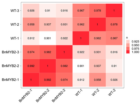 Samples from wild-type (WT) and BnMYB2 transgenic Arabidopsis plants under 50 μM Cd treatment for 24 h were sequenced on an Illumina Novaseq™ 6000 platform. In total, from 39.69–52.58 Mb clean reads with between 5.95 and 7.89 Gb nucleotides were acquired from each sample after the adaptor sequences and low-quality reads were removed, coupled with at least a 94% valid ratio. The sequencing data covered more than 96% of the reference genome of Arabidopsis, with Q20 ≥ 99% and Q30 ≥ 98% (Table 1). To analyze the degree of biological repeatability among samples, the Pearson correlation coefficients were calculated among each pair of the individual samples and presented as heatmaps, indicating that the correlation coefficient between two biological replicates of WT or transgenic plants were all above 0.96 (Figure 1). The results above indicate that the quality of RNA-Seq data can satisfy the requirements of the subsequent analysis. The transcriptome data are available from NCBI with accession number SRP422102.