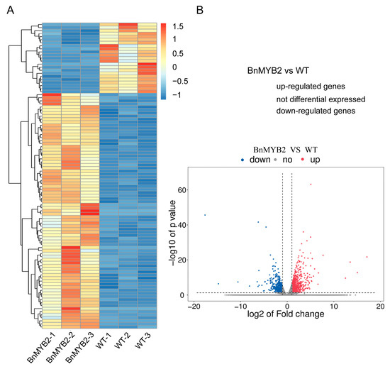 The expression level of each gene was estimated using FPKM (fragments per kilobase of exon model per million mapped reads) value. The differentially expressed genes were selected with an FC (fold change) of ≥2 or an FC of ≤0.5 and p-value of <0.05. A total of 1598 differentially expressed genes (DEGs) were detected in BnMYB2 transgenic Arabidopsis compared to WT plants, with the expression levels of 860 genes up-regulated and 738 genes down-regulated (Table S2). A heatmap (Figure 2A) and a volcano plot (Figure 2B) were used to represent the abundance of different expression genes, with expression levels ranging from low (blue color) to high (red color). The expression patterns of up-regulated or down-regulated genes among three biological replicates showed high similarity, indicating that the results of RNA-seq were stable and reliable.