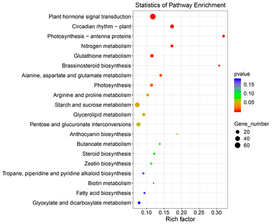 The Kyoto Encyclopedia of Genes and Genomes (KEGG) is a knowledge database to systematically analyze the metabolic pathways of gene products in cells and the functions of these gene products, which is useful for researching genes and their expression information as a whole network. The top 20 enriched KEGG pathways of DEGs in BnMYB2 transgenic plants versus WT plants are presented as scatter plot (Figure 4). According to KEGG analysis, DEGs were significantly enriched in 8 pathways (p < 0.05) involved in plant hormone signal transduction (ko04075), plant circadian rhythm (ko04712), photosynthesis-antenna proteins (ko00196), nitrogen metabolism (ko00910), glutathione metabolism (ko00480), brassinosteroid biosynthesis (ko00905), alanine, aspartate and glutamate metabolism (ko00250) and photosynthesis (ko00195) (Table S4).