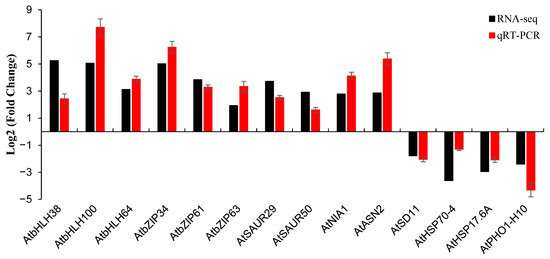 To verify the accuracy of DEG data obtained from RNA-seq, three DEGs belonging to bHLH transcription factors (AtbHLH38, AtbHLH64, AtbHLH100), three DEGs belonging to bZIP transcription factors (AtbZIP61, AtbZIP63, AtbZIP29), two DEGs belonging to the SAUR family (AtSAUR29 and AtSAUR50), one DEG from the nitrogen metabolism pathway (AtNIA1), one DEG from the alanine, aspartate and glutamate metabolism pathway (AtASN2) and four DEGs down-regulated were selected for quantitative RT-PCR (qRT-PCR). The RNA samples used for qRT-PCR were the same as those used for RNA sequencing. The results showed that the expression pattern of 14 DEGs in the qRT-PCR test was consist with the results of transcriptome sequencing, suggesting the high reliability of the RNA-seq (Figure 5).