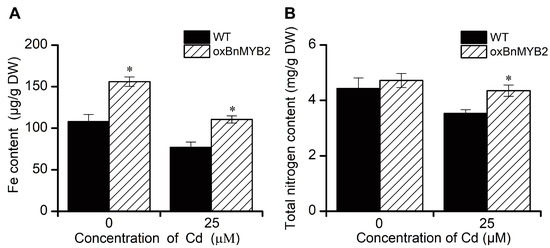 The above RNA-seq results showed that the Ib subgroup bHLH genes (AtbHLH38, AtbHLH39, AtbHLH100 and AtbHLH101) involved in maintaining Fe homeostasis, and four genes (AtNIA1, AtNIA2, AtNIR1 and AtASN2) associated with N assimilation, were significantly upregulated in BnMYB2 transgenic Arabidopsis plants. In order to investigate whether the accumulation of Fe and nitrogen were affected in the transgenic plants, three-week-old Arabidopsis seedlings grown on vermiculite were treated with 0 or 25 μM Cd for another seven days, and then the Fe and total nitrogen content were determined. As shown in Figure 6, the Fe content in BnMYB2 transgenic plants is approximately 1.4-fold significantly higher than that of WT plants under 0 or 25 μM Cd treatments (Figure 6A). The total nitrogen content in transgenic plants was slightly higher than WT plants under normal conditions, while it was significantly improved in transgenic plants under Cd stress (Figure 6B). These results indicate that BnMYB2 regulated the expression of the eight genes above and enhanced the Fe and nitrogen content in the transgenic plants under Cd stress, which helped to alleviate the Cd toxicity in the plant tissues.