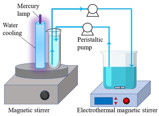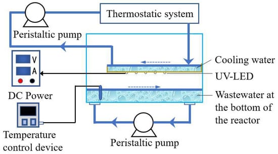 As a coolant, the flow rate and temperature of the wastewater affect the cooling performance of the UV-LED array, which in turn affects the luminescence efficiency of LED beads, and, ultimately, the degradation performance of wastewater. In addition, as a reactant, the flow rate and temperature of the wastewater also directly affect the photocatalytic reaction, so the cooling performance and degradation performance need to be studied separately, as shown in Figure 1. Therefore, the cooling system was separated from the reaction system. A quantity of 140 mL of cooling water on the surface of the UV-LED array substrate was circulated by a peristaltic pump, and the inlet temperature was controlled by a thermostatic system. The 400 mL of wastewater at the bottom of the reactor was circulated by a peristaltic pump and the inlet temperature was controlled by a temperature control device.