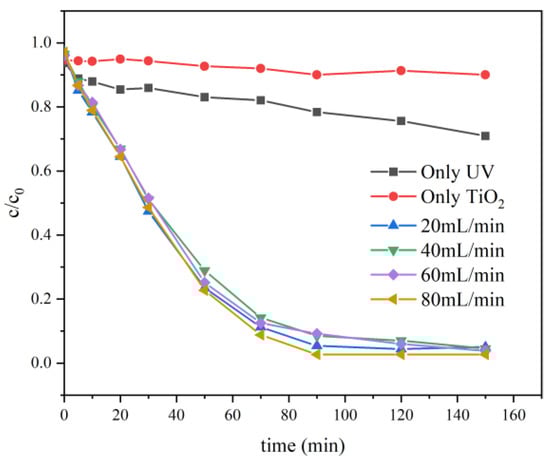 The wastewater flow rate affected the residence time and mass transfer of wastewater in the synergistic system. The initial concentration of AR 26 was 15 mg/L, the concentration of TiO2 was 1 g/L, the temperature of the cooling water and the bottom wastewater was 25 °C, and the flow rate of the cooling water was 80 mL/min. The degradation experiment was carried out by adjusting the wastewater flow rate in the range of 20~80 mL/min. The results are shown in Figure 2. A higher cooling water flow rate offered better degradation performance until the wastewater was decolorized. This was because the wastewater retention time in the pipeline decreased with increase in flow rate, which meant the cumulative UV irradiation time rose. When the flow rate reached 80 mL/min, the overall exposure time of the wastewater to UV irradiation was the longest, and the dye decolorization rate was the highest at 97.3%. However, at the lowest flow rate, 20 mL/min, the residence time in the pipeline was the longest. The exposure time to UV irradiation of the whole wastewater was the shortest, so the dye decolorization rate of 94.6% was lower than that at the highest flow rate. Thus, the wastewater flow rate was adjusted to 80 mL/min to achieve a better cooling effect and decolorization performance.