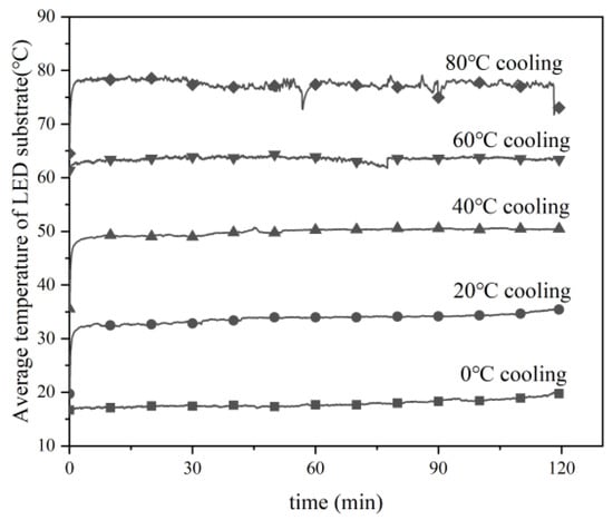 The average temperature of the LED array substrate at cooling water temperatures of 0, 20, 40, 60, and 80 °C.