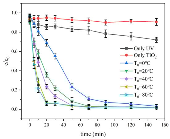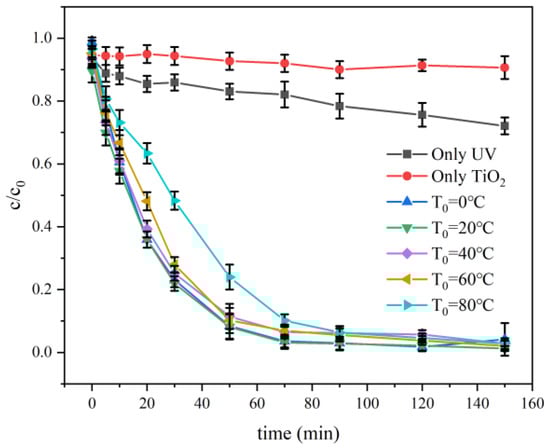 Regarding the effect of temperature on the rate of photocatalytic reaction, this can be explained as follows: ① Adsorption of organic matter: adsorption, as an exothermic reaction, readily occurs at lower temperatures (<80 °C) and does not readily occur at higher temperatures; ② Apparent activation energy: Due to the activation effect of photons, the apparent activation energy of the photocatalytic reaction is usually the smallest at 20~80 °C, and the reaction can occur easily. At low temperatures (<0 °C), the apparent activation energy increases, making the photocatalytic reaction challenging []; ③ Charge-hole complexation: It has been shown that overly high reaction temperatures (>80 °C) promote charge-hole complexation, which is not conducive to the adsorption of organic compounds on the catalyst surface [].