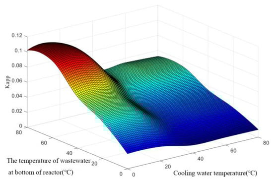To clarify the influence of single or multiple factors on performance and to obtain optimal conditions, statistical analysis of the results can be performed []. Matlab software was used to numerically determine the relationship between the first-order rate constant and the cooling water and the temperature of the wastewater at the bottom of the reactor, as shown in Figure 7. It can be seen that the effect of the temperature of wastewater at the bottom of the reactor and the LED array temperature on the reaction rate is opposite, and that the effect of the temperature of the wastewater at the bottom of the reactor is more marked. According to the above analysis, the suitable wastewater temperature is 20~60 °C. Although higher wastewater temperature results in a faster reaction rate, our previous studies have shown that an overly high wastewater temperature negatively impacts the long-term stability of LED beads []. Therefore, considering the long-term stability of operation, the optimal wastewater temperature is 20 °C (at room temperature).