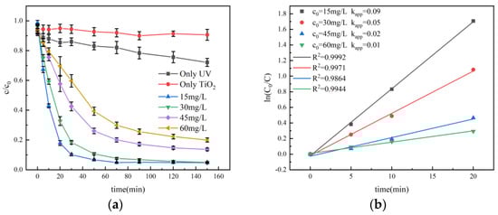 (a) Evolution of AR 26 concentration with different initial concentrations; (b) Kinetic fits for initial concentrations of 15, 30, 45, and 60 mg/L.