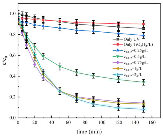 To determine the optimal catalyst dosage for the photocatalytic reaction, 0~2 g/L TiO2 was selected. As shown in Figure 9, the reaction rate constant increased from 0.002 to 0.014, and the degradation rate increased from 22.46% to 63.44%, with a TiO2 dosage range of 0~0.5 g/L. As the catalyst concentration increased to 0.75 g/L, the reaction rate increased from 0.014 to 0.027, and the degradation rate increased from 63.44% to 84.20%. Increasing catalyst concentration was not able to significantly enhance the photocatalytic reaction rate and the reaction rate plateaued.