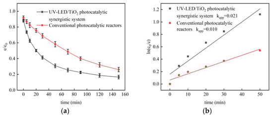 (a) Comparison of wastewater degradation performance between UV-LED/TiO2 photocatalytic synergistic system and conventional photocatalytic reactor when the wastewater flow rate was 80 mL/min, the temperature was 20 °C, initial AR 26 concentration was 45 mg/L, TiO2 concentration was 0.75 g/L and pH = 2; (b) Kinetic fit for two photocatalytic systems.