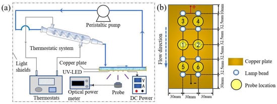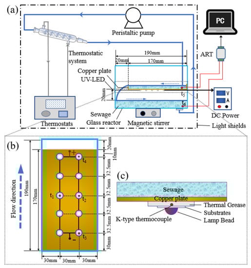The UV-LED/TiO2 photocatalytic synergistic system comprises a photocatalytic reactor, a wastewater circulation module, and a data acquisition system. As shown in Figure 12a, the photocatalytic reactor is a glass vessel (190 × 90 × 190 mm) with a luminescence system, which presents 10 UV-LED beads with single-layer copper plates (170 × 90 × 2 mm). Ten UV-LED beads were evenly arranged at the bottom of the copper plate, with five beads in each group connected in series and two groups merged in parallel, as shown in Figure 12b. The UV-LED beads were glued to the bottom of the copper plate by thermal conductive paste, and K-type thermocouples were fixed on the surface of the LED substrate, as shown in Figure 12c. The copper plate with UV-LED beads was set inside the reactor with the beads 20 mm from the wastewater surface in the vertical direction.