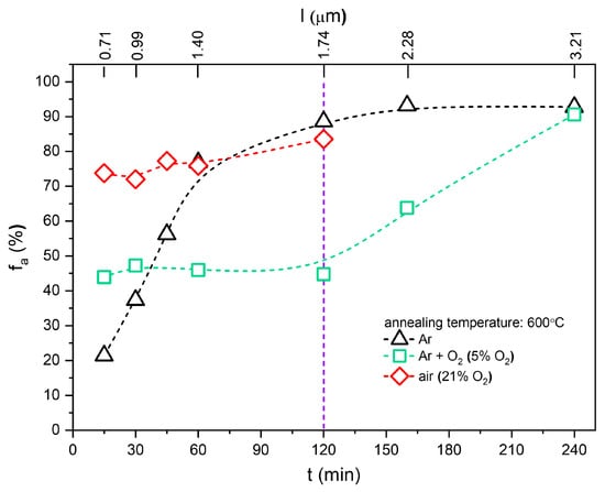 The impact of reaction time on the amount of anatase fraction in different annealing atmospheres at 600 °C.