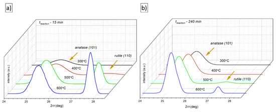 XRD in situ measurement (300°-600°C) of TiO2 flower-like nanostructures obtained for 15 (a) and 240 min (b).
