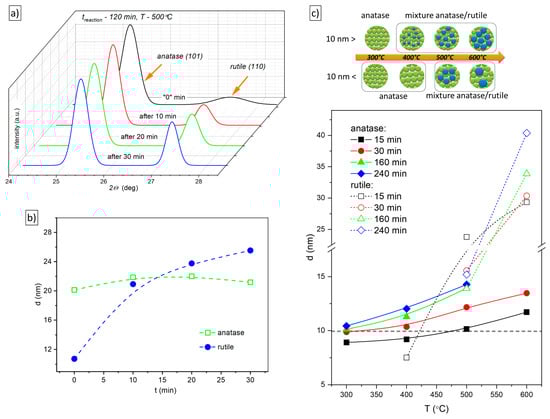 For the reflex of anatase I(101), no significant changes are evident. This is likely related to the rate of phase growth. According to the report by Li et al. [12], rutile grows rapidly after nucleation, while anatase grains remain practically unchanged. Temperature controls heat and mass transport, which affects the growth of anatase particles (Figure 5c). When the size of the particles decreases, the degree of possible contact between them increases and it becomes easier to overcome the energy barrier (less activation energy) to undergo phase transformation [48,49].