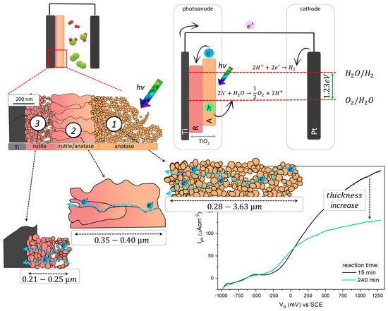 The results of studies reported in the literature show that the high photoelectrochemical or photocatalytic activity of titanium dioxide with different phases of the composition materials may be related to different mechanisms [5,36,61,62,63,64]. The first of these is described by the existence of synergistic effects between the TiO2, anatase, and rutile phases. One of the best-known illustrations is Evonik–Degussa TiO2 P25 (anatase to rutile ratio: 80/20), which is considered a reference material for photocatalytic reactions. Another approach is based on the different positions of the minimum of the conductivity bands of anatase and rutile in relation to the position of the hydrogen reduction level. In addition, it is also necessary to consider the differences in the values of the band gap. The proposed band alignment in multiphase anatase-rutile heterojunctions considers alternative possibilities. If the conduction band of anatase lies above the conduction band of rutile, then, because of illumination, electrons are transported to rutile. In the opposite case, the transport of photogenerated electrons goes to the anatase. In the case of the photodecomposition process of water in a PEC with an n-type photoanode, the position of the bands should allow the direct flow of electrons from the anode to the cathode via an external circuit. However, photoholes are involved in the oxygenation reaction of water at the anode surface.