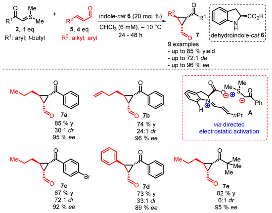 The first contribution of an organocatalytic Corey–Chaykovsky cyclopropanation came from MacMillan and coworkers in 2005, where they used sulfonium ylides 2, α,β-unsaturated aldehydes 5, and a chiral dehydroindole organocatalyst (indole-cat 6). Cyclopropanes 7 (9 examples) were achieved in good yields (up to 85%) with excellent diastereoselectivities (up to 72:1) and enantioselectivities (up to 96% ee). The authors proposed a mode of activation that involved a directed electrostatic activation from the carboxylate and sulfonium functions, via intermediate A. The iminium Z isomer was suggested considering the minimization of the Van der Walls interaction between the aryl hydrogen and olefin (Scheme 3) [28].