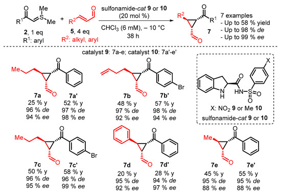 In the same year, Arvidsson and coworkers reported more modifications of organocatalysts using a sulfonamide group, which shared the same dehydroindole core with 6 and 8. A comparison with their and MacMillan’s work showed that the new organocatalysts 9 and 10 furnish the cyclopropanes 7a–7e, 7a′–e′, with high selectivity (up to 98% de and 99% ee), although at lower yields (up to 58%) (Scheme 5) [30].