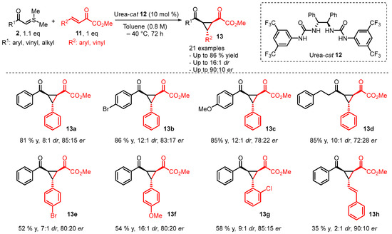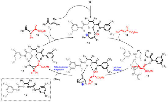 In 2011, Chen, Xiao, and coworkers reported asymmetric cyclopropanation of β,γ-unsaturated-α-keto-esters 11 with sulfoxonium ylides 2, catalyzed by chiral urea (urea-cat 12), which afforded 1,2,3-trisubstituted cyclopropanes 13 (21 examples) in good yields (up to 86%) and moderate to good selectivities (up to 16:1 dr and up to 90:10 er). The use of toluene as solvent at a low temperature (−40 °C) for 72 h provided the optimal condition (Scheme 6) [31]. The authors proposed a catalytic cycle starting with the coordination of urea-cat 12 with sulfonium ylide 2, followed by the coordination of β,γ-unsaturated-α-keto-ester 11. The chiral environment in intermediate 15 leads to an enantioselective Michael addition, followed by alkylation, giving complex 17. This regenerates the organocatalyst, furnishing the cyclopropane 13 (Scheme 7) [31,32].