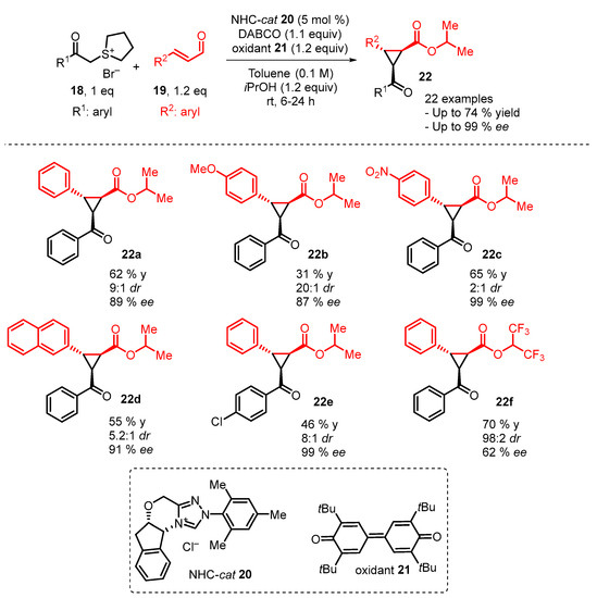In 2012, Studer and coworkers reported an oxidative NHC-catalyzed Corey–Chaykovsky cyclopropanation of α,β-unsaturated aldehydes 19 with sulfonium ylides 18. Chiral NHC-catalyst (NHC-cat 20), DABCO, benzoquinone-derivative 21, and iPrOH were used in toluene at rt to afford cyclopropanes 22 (22 examples) in good yields (up to 74%) and excellent ee (up to 99%) (Scheme 8) [33]. The authors proposed a catalytic cycle involving the addition of NHC-cat 20 to aldehyde 19 to form a Breslow intermediate, which is oxidized by quinone to form intermediate 23. 1,4-addition of sulfonium ylide B, which was formed in situ from sulfonium salt 18, to intermediate 23 gives enolate 25, followed by cyclopropanation to furnish intermediate 26. Next, alcoholysis releases product 22, regenerating the NHC-cat (Scheme 9) [33,34,35].