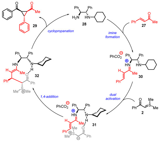 In 2013, Liu, Feng, and coworkers reported an asymmetric Corey–Chaykovsky cyclopropanation of α,β-unsaturated ketones 27 with sulfonium ylides 2, catalyzed by chiral amine 28. Furthermore, benzoic acid, CHCl3, and 5 Å MS were used at 30 °C to furnish cyclopropanes 29 (20 examples) in good yields (up to 68%) and excellent ee and dr (up to 93% ee and >95:5 dr), with an improvement in ee after a single recrystallization (up to 99% ee) (Scheme 10). The authors have proposed that the mechanism starts with the formation of iminium 30 from the reaction of amine-cat 28 and unsaturated ketone 27, mediated by benzoic acid. Next, the secondary amine group from intermediate 30 coordinates with sulfonium ylide 2 via hydrogen bonding. This was followed by 1,4-addition and cyclopropanation by enamine attack to furnish the desired product 29 (after hydrolysis) and the amine-cat 28 (Scheme 11) [36].