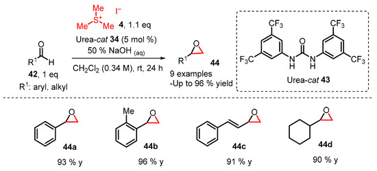 In 2008, Connon and coworkers reported urea-organocatalyzed Corey–Chaykovsky epoxidation using aldehydes 42, trimethylsulfonium iodide 4, and aqueous NaOH in CH2Cl2 at rt to furnish epoxides 44 (9 examples) in excellent yields (up to 96%). The purpose of the urea-cat 43 was to accelerate the attack of the sulfonium methylide on the carbonyl group of 42, which is the rate-determining step in this reaction (Scheme 14) [39].