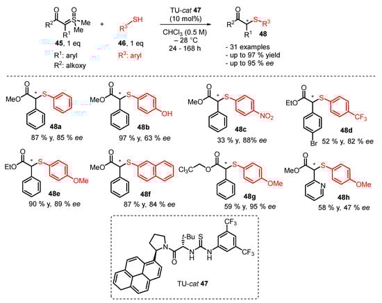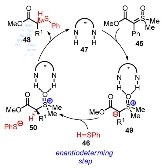 In 2020, Mattson, Burtoloso, and coworkers reported the first enantioselective formal S–H insertion reaction of pro-chiral sulfoxonium ylides 45. Besides the ylide, an aromatic thiol 46 and thiourea organocatalyst (TU-cat 47) in CHCl3 were used. The reaction was carried out at a lower temperature (–28 °C) and afforded α-thiol ester 48 (31 examples) in excellent yields (up to 97%) and with excellent enantioselectivity (up to 95% ee) (Scheme 15). The proposed mechanism, supported by 1H NMR and DFT calculations, indicates that the first step is the formation of a hydrogen bond between the TU-cat and the S=O bond of the sulfoxonium ylide to yield the intermediate 49. The next step is the protonation of 49 with H–SPh, which is both a rate-determing and enantiodeterming step, leading to 50. The SN2 reaction of thiolate with 50 then furnishes the desired product 48 and regenerates the organocatalyst 47 (Scheme 16) [48,49].