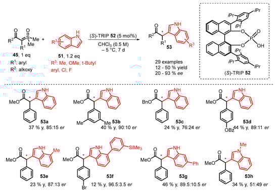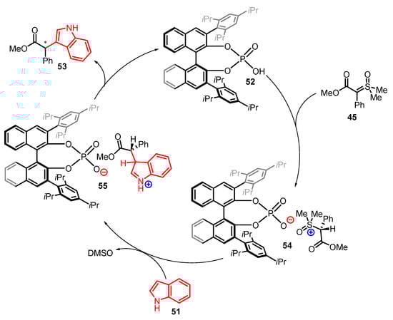 In 2021, Mattson, Burtoloso, and coworkers developed a formal C–H insertion reaction of indoles 51 into sulfoxonium ylide esters 45, using a chiral phosphoric acid (S)-TRIP 52 in CHCl3 at low temperature (−5 °C), providing the C–C bond adducts 53 (29 examples) in moderate yields (up to 50%) and good to excellent enantioselectivity (up to 93% ee). It is noteworthy that no indole protection is required (Scheme 17). The mechanism proposed by the authors involves the protonation of sulfoxonium ylide with (S)-TRIP, forming complex 54, with charged species in protonated ylide and organocatalyst. Subsequently, indole performs an electrophilic aromatic substitution reaction, leading to the intermediate 55, which undergoes a rearomatization of the indole ring via proton abstraction from (S)-TRIP, yielding the product 53, and regenerating the organocatalyst 52 (Scheme 18) [50].