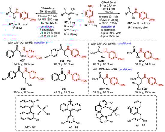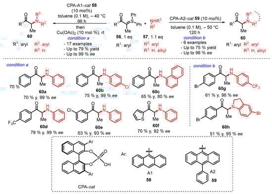 In 2020, Li, Sun, and coworkers reported an organocatalytic formal N–H insertion reaction using sulfonium ylides 56 and anilines 57, catalyzed by chiral phosphoric acid (CPA-cat). In the majority of examples (EDG and slightly EWG), a two-step procedure involving the formal N–H insertion reaction catalyzed by CPA-A1-cat 58, followed by a Cu(OAc)2-mediated oxidation, was employed. α-amino ketones 60 (17 examples) were obtained with excellent enantioselectivities (up to 99%). For secondary amines and alkyl groups (R2) in sulfonium ylides, CPA-A2-cat 59 allowed the products 60 (6 examples) and 60′ (7 examples), respectively, in excellent selectivities (up to 96% ee and 98% ee, respectively), without any additional operation (Scheme 19 and Scheme 20). In the case of α-amino esters 60″, with the Me group at R2, CPA-A3-cat 61 was employed, leading to products with very good selectivities (up to 86% ee). However, with longer alkyl groups, the SPINOL catalyst (CPA-A4-cat 62) provided the α-amino esters 60″ in excellent ee (up to 95%; Scheme 20). The authors proposed a mechanism starting with the protonation of the sulfonium ylide by CPA-cat, leading to the intermediate 63, which was epimerized to 63′ in equilibrium. The attack of aniline in preferred face furnished product 60, via dynamic kinetic resolution, with extrusion of Ph2S and regeneration of the organocatalyst. If the applied aniline is not reactive, the deprotonated CPA-cat will dispose of the Ph2S, leading to an inactive subproduct 64 (Scheme 21) [51].