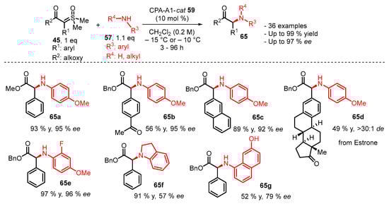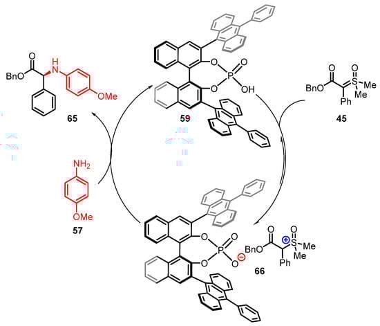 In 2021, Sun, Huang, and coworkers reported an organocatalytic N–H insertion using esters of sulfoxonium ylides 45, unprotected amines 57, and chiral phosphoric acid catalyst (CPA-A1-cat 59) in CH2Cl2 at low temperature to enable enantioenriched α-aryl glycines 65 (36 examples) with excellent yields (up to 99%) and enantioselectivities (up to 97% ee; Scheme 22). Compared to Burtoloso’s N–H insertion work, which used a copper/squaramide co-catalyzed system, this report used a metal-free approach [52,53]. The mechanism proposed by the authors involves protonation of the sulfoxonium ylide with CPA-A1-cat 59 in an equilibrium favoring intermediate 66. The nucleophilic attack of the amine 57 is rate the determing step, providing the product 65 and regenerating the organocatalyst 59 (Scheme 23) [54].
