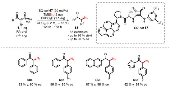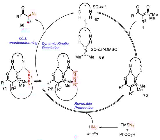 In 2022, Guo, Sun, and collaborators reported an organocatalyzed azidation of sulfoxonium ylides 1 to afford chiral tertiary azides 68 (18 examples) in excellent yields (up to 96%) and enantioselectivities (up to 96% ee). In this reaction, pro-chiral sulfoxonium ylides were employed, and a squaramide organocatalyst (SQ-cat 67), TMSN3, and PhCO2H were used as reactants to obtain HN3 in situ. Although acid was involved in the reaction, mechanistic studies showed that no epimerization occurred. The choice of CHCl3 as the solvent and the lower temperature proved to be crucial in obtaining higher enantioselectivity (Scheme 24). The authors proposed a mechanism involving the first hydrogen bonding of SQ-cat 67 to sulfoxonium ylide 1, yielding intermediate 70, followed by protonation with HN3. In this case, the step provides two epimerizable intermediates 71 and 71′, in reversible protonation. The next step, rate determing and enantiodeterming, involves the SN2 reaction of azide with intermediate 71, via dynamic kinetic resolution, providing the product 68 and the SQ-cat 67, capable of coordinating with DMSO (SQ-cat•DMSO 69) (Scheme 25) [55].