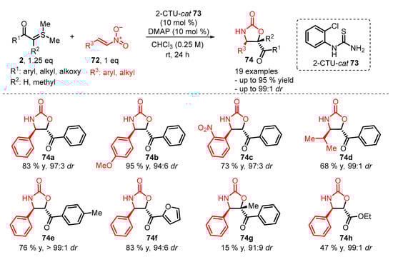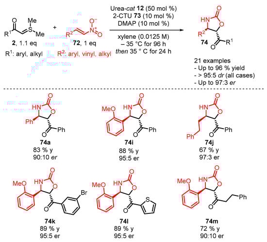 In 2008, Xiao and coworkers reported a urea catalyzed (4 + 1)/rearrangement cascade reaction of sulfonium ylides 2 with nitroolefins 72 that furnished 4,5-disubstituted oxazolidinones 74 (19 examples) in excellent yields (up to 96%) and with excellent diastereoselectivity (up to >99:1 dr). It was important to use 2-CTU 73 and DMAP as additives because both promoted the complex formation and rearrangement steps, respectively. This method proved to be tolerant to a wide range of nitroolefins and sulfonium ylides, although substitution at the α-carbonyl position of the sulfonium ylide resulted in lower yields (Scheme 26). Their proposed catalytic cycle, supported by NMR and labeling studies, starts with the coordination of 2-CTU-cat 73 with nitroolefin to obtain the intermediate 75. Michael’s addition of sulfonium ylide led to Michael adduct 76, and subsequent intramolecular O-alkylation afforded intermediate 77, in equilibrium with bicycle 78. The deprotonation of 78 by DMAP, followed by ring opening, furnishes intermediate 79 and oxazirene 80, respectively. Ring opening by strain release of the three-membered ring leads to the formation of nitrene 81, followed by Hofmann rearrangement, yielding isocyanate 82. The ring-closing reaction and protonation give intermediate 83 and oxazolidinone 74, respectively (Scheme 27) [56].