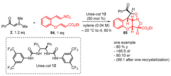 In 2009, as an application of the formal (4 + 1)/(3 + 2) cycloaddition cascade of sulfonium ylide 2 and nitroolefin 84, Xiao and coworkers employed chiral urea organocatalyst (Urea-cat-12) in xylene at low temperature to deliver the desired product 85 in 80% yield, 95:5 dr and 90:10 er (with an increase to 99:1 after one recrystallization). In this reaction, five stereocenters were obtained in one step, and at the time it represented the first successful example of a chiral Brønsted acid catalyzed reaction involving sulfur ylides (Scheme 28) [57].