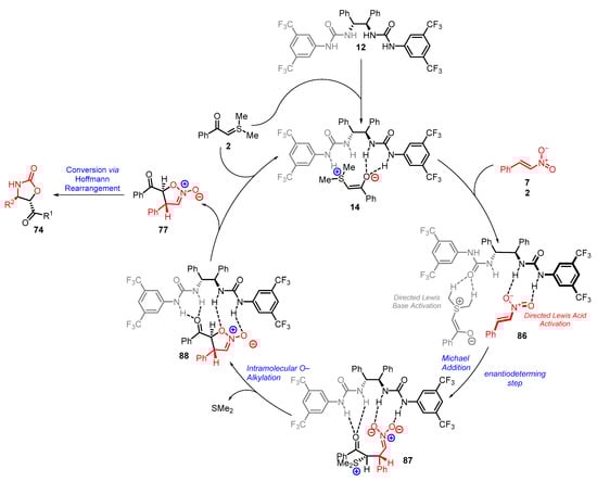 In 2012, the same group reported a chiral urea-catalyzed (4 + 1)/rearrangement cascade reaction of sulfonium ylide 2 with nitro olefin 72, affording 4,5-disubstituted oxazolidinones 74 (21 examples) in excellent yields and enantiomeric/diastereomeric ratios. In all cases, 95:5 of the anti diastereoisomer was obtained. Temperature control was crucial (Scheme 29). Based on their mechanistic studies, the proposed catalytic cycle involves the formation of a complex between the organocatalyst and sulfonium ylide 14 through strong hydrogen bonding, followed by coordination with nitroolefin 72. This intermediate 86 undergoes a dual activation by a direct Lewis acid activation of the urea catalyst with nitroolefin and a direct Lewis base activation by sulfur ylide. The next step involves a Michael addition of sulfur ylide to the nitro olefin, leading to the Michael adduct 87 in an enantiodeterming step (followed by intramolecular O-alkylation to give complex 88). The release of the nitronate intermediate with coordination of the unreacted sulfur ylide 2 regenerates the organocatalyst. Increasing the temperature favors the Hoffmann rearrangement, providing the desired product 74 (Scheme 30) [58].