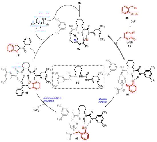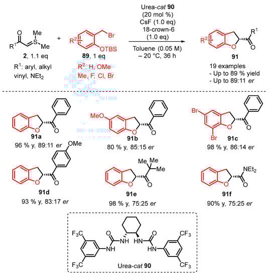 In 2017, Yang and coworkers reported an asymmetric dihydrobenzofuran synthesis from sulfonium ylides 2 and ortho-quinone methide (o-QM) generated in situ from halides 89. A chiral urea organocatalyst (Urea-cat 90) was used to induce stereoselectivity, CsF was used to promote the o-QM formation, and 18-crown-6 to enhance fluorine reactivity in toluene at low temperatures. The desired product 91 (19 examples) was obtained with excellent yields (up to 98%) and good selectivity (up to 89:11 er; Scheme 31). The authors have proposed a catalytic cycle involving the coordination of urea-cat with sulfonium ylide, leading to intermediate 92, followed by the coordination of o-QM 93, which is formed in situ by treating 89 with CsF, to form complex 94. The Michael addition, which is the stereoselective step, furnishes intermediate 95, with subsequent intramolecular O-alkylation and SMe2 extrusion. This leads to the dihydrobenzofuran product 91 and regenerates the urea-cat (Scheme 32) [59].