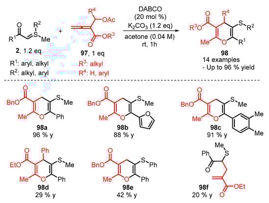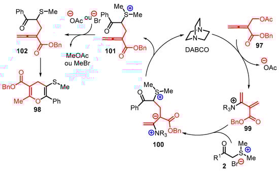 In 2012, Tong and coworkers developed an amine-catalyzed formal (3 + 3) cycloaddition of 2-(acetoxymethyl)buta-2,3-dienoate 97 with sulfonium ylides 2 to provide 4H-pyrans 98 in yields up to 96%. The allene moiety proved to be critical in this reaction, as cyclization did not occur when olefin 98f was used instead of allene 97 (Scheme 33). The authors have proposed a mechanism involving an attack of DABCO on allene 97 via SN2′, followed by 1,4-addition with sulfonium ylide 2, leading to intermediates 99 and 100, respectively. Instead of the Corey–Chaykovsky cyclopropanation, an 1,2-elimination regenerates the DABCO, and the allene intermediate 101 is obtained. Nucleophilic attack (Br– or AcO−) on sulfonium 101 provided sulfide 102 via the S–Me cleavage. Subsequent oxa-Michael addition leads to 4H-pyran 98 (Scheme 34) [60].