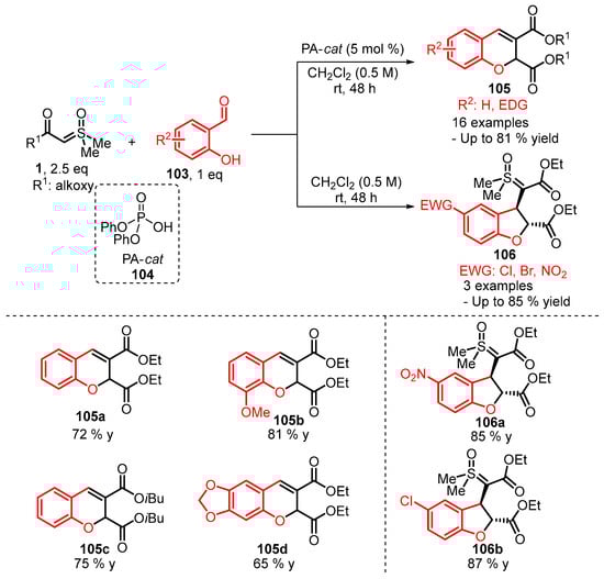 - Bisag, G.D.; Pecchini, P.; Mancinelli, M.; Fochi, M.; Bernardi, L. Sulfoxonium Ylides in Aminocatalysis: An Enantioselective Entry to Cyclopropane-Fused Chromanol Structures. Org. Lett. 2022, 24, 5468–5473. [Google Scholar] [CrossRef] [PubMed]