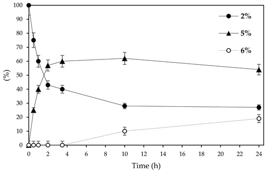 In particular, a multiplet centered at 5.09 ppm suggested the presence of 3-hydroxybutyrate oligomers [28]. The results of the ESI-MS analysis (Supplementary Materials Figure S4) of the reaction mixture confirmed the presence of a higher homolog of 5 where the ascorbyl moiety is esterified with a dimer of 4 (compound 6, Figure 1). The effect of the substrates’ molar ratio on the conversion, yield, and selectivity was studied by performing the reaction in the presence of 1, 2, or 3 equivalents of 4. The composition of the crude reaction mixture was monitored by 1H NMR by comparing the integrals of the signals attributable to the H-4 proton of the species 6 (4.65 ppm), 5 (4.67 ppm), and 2 (4.68 ppm). Figure 1 shows the composition of the reaction mixtures corresponding to the higher yields reached by the three reactions (Supplementary Materials Figure S5). It can be observed that using 2 equivalents of 4 (condition B, Figure 1), the maximum yield of 60% was reached (after 3.5 h) without the formation of the byproduct 6 (Supplementary Materials Figure S5). On the other hand, the best yields reached by the reactions performed with 1 and 3 equivalents of 4 (conditions A and C, Figure 1) were 50% and 60%, respectively (obtained after about 4 and 3 h); however, in these cases, the mixtures contained 11% and 22% of the byproduct 6, respectively (Supplementary Materials Figure S5). Figure 2 shows the time course of the reaction performed with 2 equivalents of 4. As can be observed, the byproduct 6 started yielding after about 4 h and its concentration linearly increased at longer reaction times, making crucial the monitoring of the reaction course (Supplementary Materials Figure S6). In the attempt to reduce the formation of 6, the reaction was also performed at the lower temperature of 50 °C but, in this case, only a kinetic delay was observed with an equivalent slowing down of both the rates of formation of 5 and 6 (data not shown).