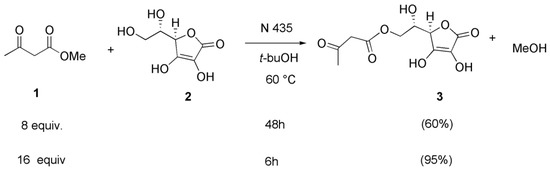 N-435-catalyzed synthesis of 6-O-acetoacetyl ascorbic acid 3: (a) reaction volume 5 mL, 1 (0.91 M), 2 (114 mM), t-butanol (4 mL), 5 Å molecular sieves (0.8 g), N 435 (40 mg), yield determined by 1H-NMR (less than 10% after column chromatography); (b) reaction volume 5 mL, 1 (1.82 M), 2 (114 mM), t-butanol (4 mL), 5 Å molecular sieves (0.8 g), N 435 (40 mg), yields calculated on the amount of product 3 isolated after evaporation of the solvent and of the unreacted 1.