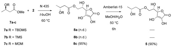 Chemo-enzymatic synthesis of 5 through the O-protected intermediate 7a–c. Reaction conditions: 7a–c (2.85 mmol, 5 equiv.), 2 (0.57 mmol), t-butanol (8 mL), 5 Å molecular sieves (0.8 g), and N 435 (80 mg); n.d. = not detected.